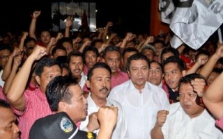 TETAP MAJU- Hadi Prabowo dan Don Murdono (tengah) diiringi ratusan pendukungnya saat tiba di KPU Jawa Tengah, Selasa (5/3/2013) malam. Mereka mendaftarkan diri sebagai pasangan cagub dan cawagub yang diusung enam partai menengah.