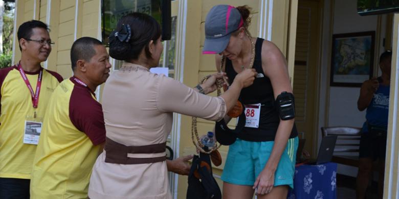 Peserta MesaStila Challenge dikalungkan medali setelah tiba di garis finis di Stasiun Mayong, MesaStila, Ambarawa, Jawa Tengah, Minggu (6/10/2013).Sementara rute lari dengan menyusuri jalur kereta, sangat dinikmati oleh para peserta. Salah satunya Dessy yang datang Jakarta.