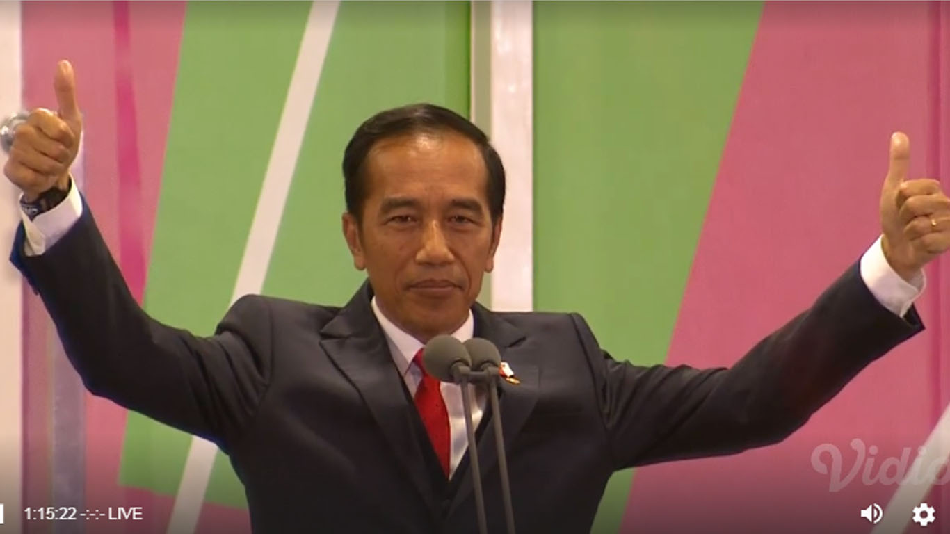 Jokowi sempat melambaikan tangan kepada para tamu undangan saat namanya disebut oleh pembawa acara.