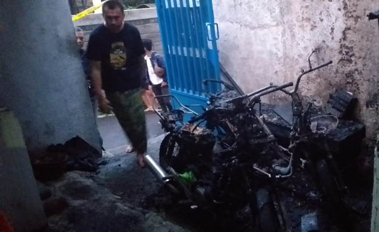 Akibat teror kain api tersebut, dua sepeda motor milik Ace Sutrisno hangus terbakar di garasi motor belakang rumahnya.