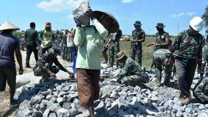 TRIBUNJATENG.COM, TEGAL - Memindahkan atau langsir batu dengan cara di panggul dan estafet terus diaplikasikan anggota Satgas TMMD Reguler 105 Kodim 0712 Tegal bersama masyarakat Desa Jatimulya, Kecamatan Suradadi, Kabupaten Tegal, Jawa Tengah.