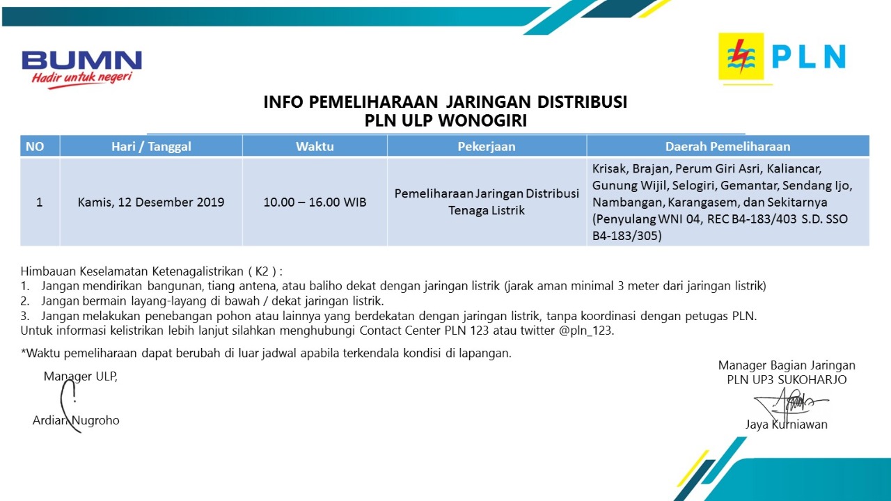 PELANGGAN PLN yang terhormat, dalam rangka meningkatkan pelayanan dan mengamankan pasokan listrik kepada pelanggan, maka dengan ini kami sampaikan informasi pekerjaan pemeliharaan jaringan listri ULP Wonogiri.