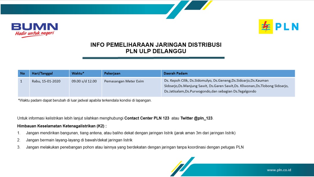 Pelanggan PLN yang terhormat, dalam rangka meningkatkan pelayanan dan mengamankan pasokan listrik kepada pelanggan, maka dengan ini kami sampaikan informasi pekerjaan pemeliharaan jaringan listrik PLN ULP Delanggu