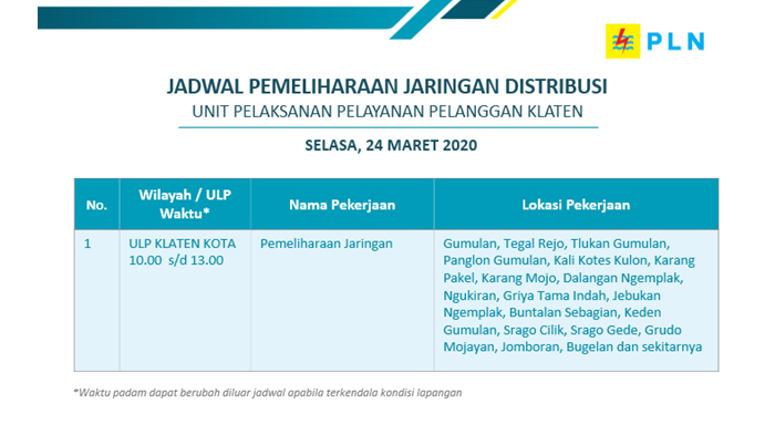 PELANGGAN PLN yang terhormat, dalam rangka meningkatkan pelayanan dan mengamankan pasokan listrik kepada pelanggan, maka dengan ini kami sampaikan informasi pekerjaan pemeliharaan jaringan listrik PLN ULP Klaten Kota