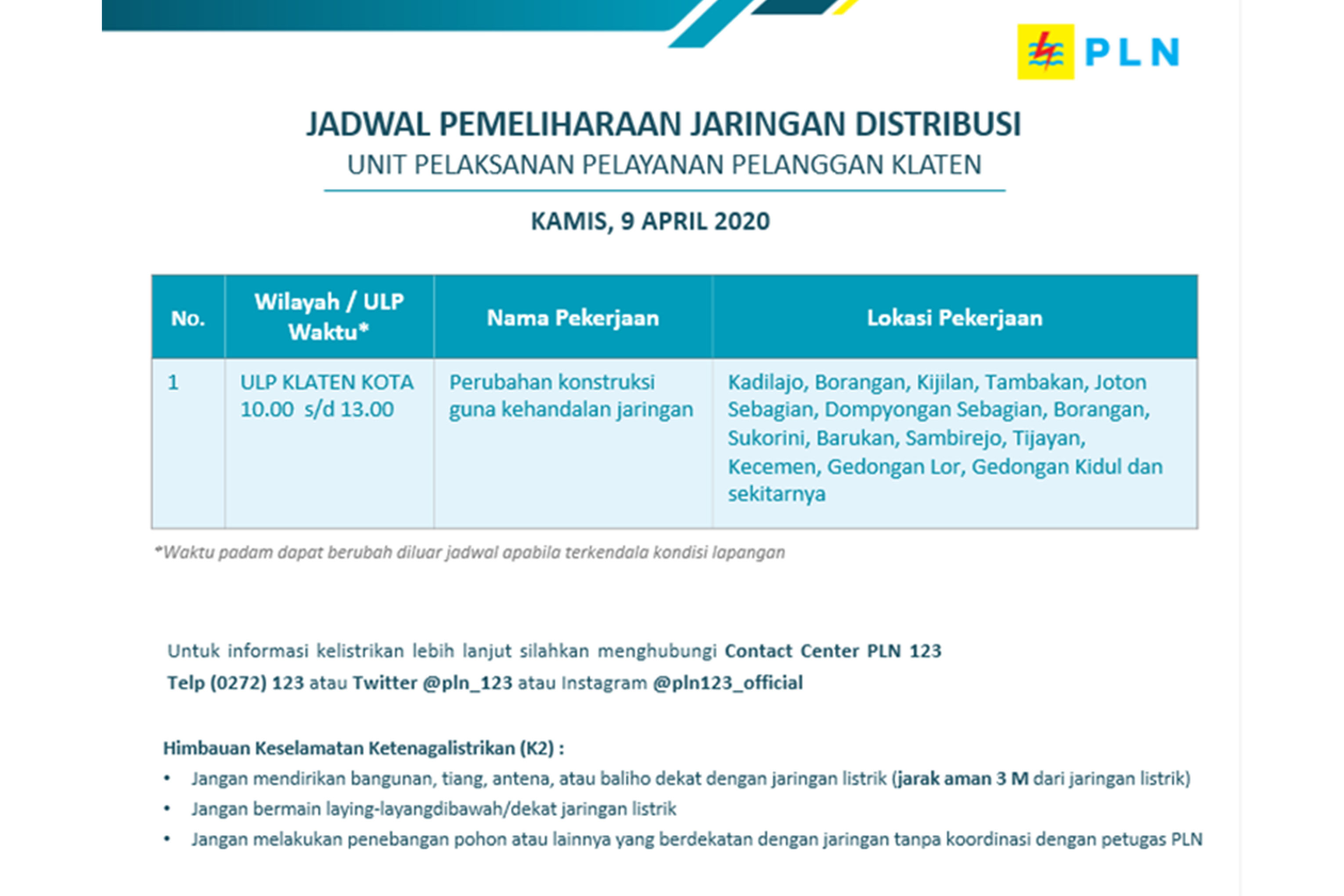 PELANGGAN PLN yang terhormat, dalam rangka meningkatkan pelayanan dan mengamankan pasokan listrik kepada pelanggan, maka dengan ini kami sampaikan informasi pekerjaan pemeliharaan jaringan listrik PLN ULP Klaten Kota.