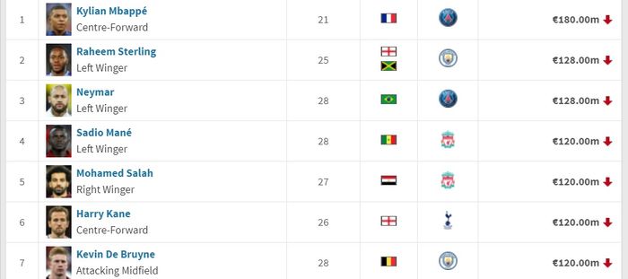 Mudah dilihat, daftar pemain di situs Transfermarkt semuanya mendapatkan gambar panah merah ke bawah yang berarti nilai pasarnya turun.