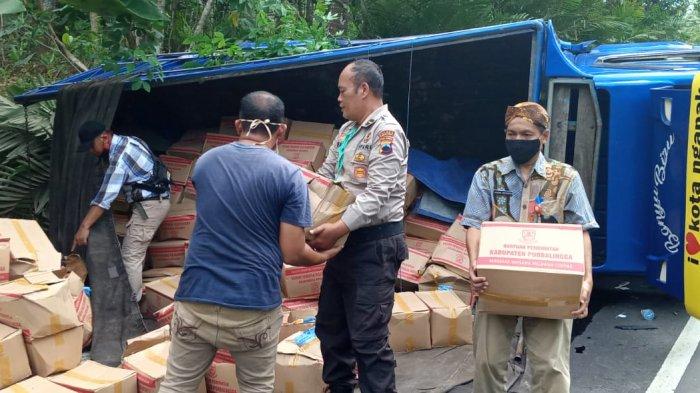 Sebuah truk pengangkut bantuan sembako dari Pemerintah Kabupaten Purbalingga untuk masyarakat Desa Losari terguling.