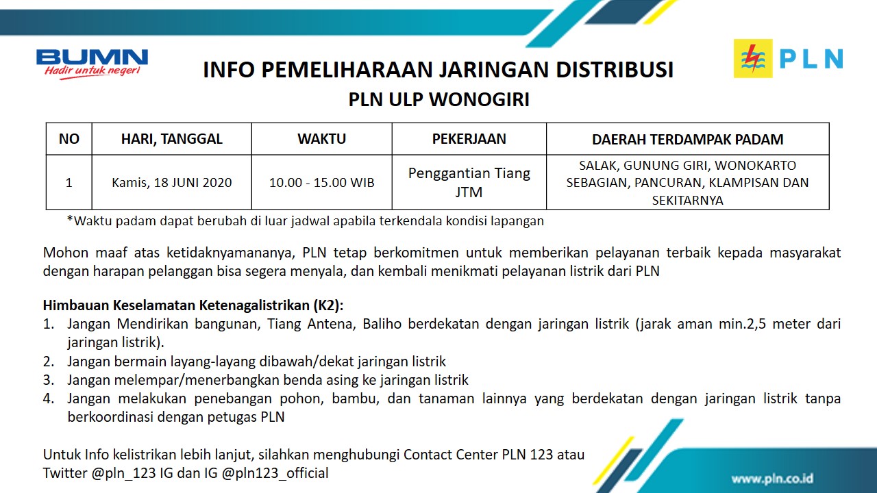 PELANGGAN PLN yang terhormat, dalam rangka meningkatkan pelayanan dan mengamankan pasokan listrik kepada pelanggan, maka dengan ini kami sampaikan informasi Pemeliharaan Jaringan listrik PLN ULP Wonogiri :