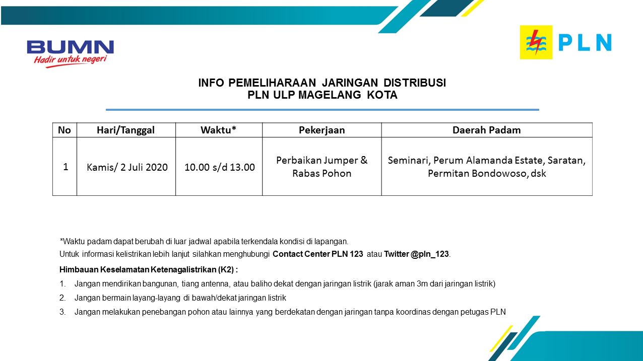 Info Pemeliharaan Jaringan Listrik PLN ULP Magelang Kota, Kamis 2 Juli 2020