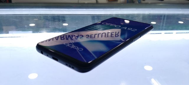 "Layar Oppo A92 sudah pakai desain terbaru neo-display, ada semacam lingkaran kecil di sudut kiri atas untuk kameranya.