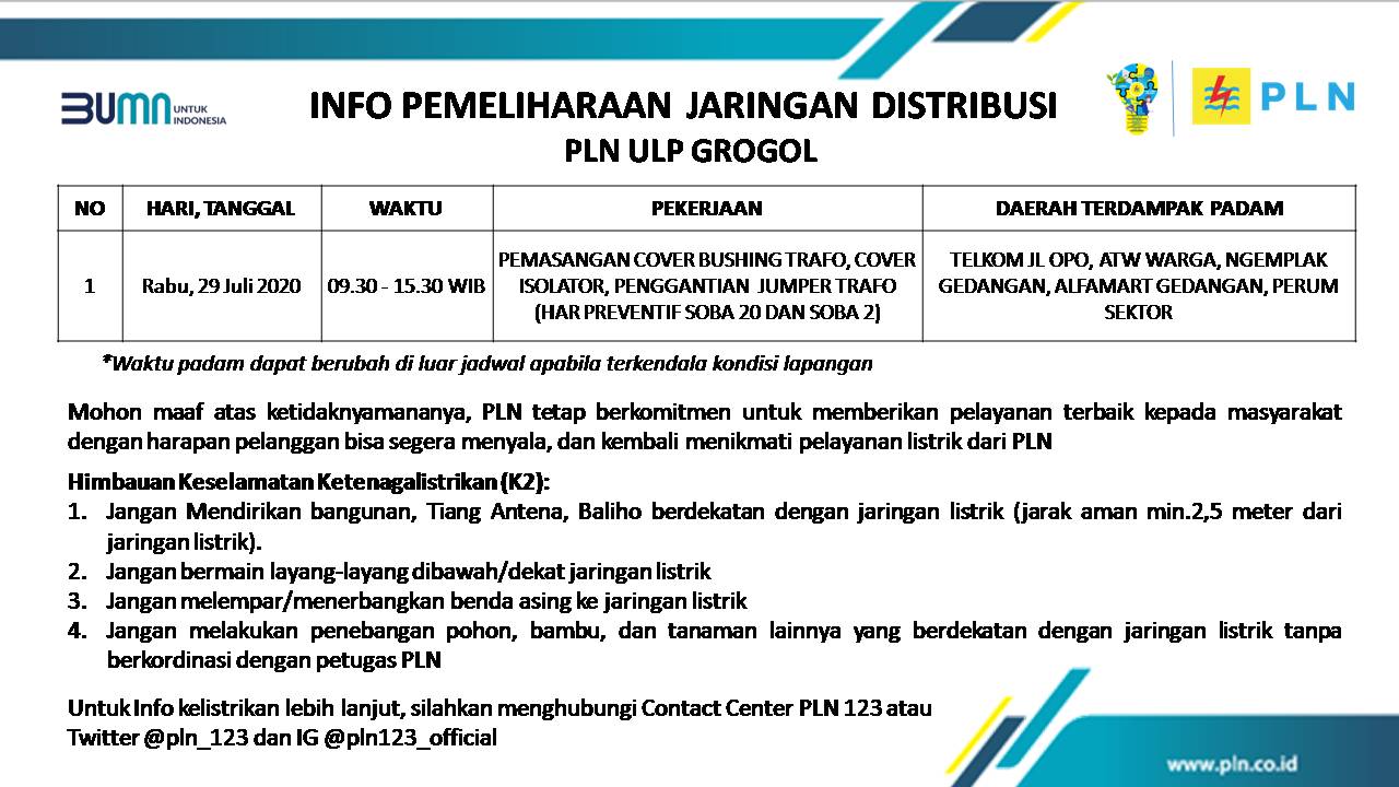 Info Pemeliharaan Jaringan Listrik PLN ULP Grogol Sukoharjo Rabu 29 Juli 2020