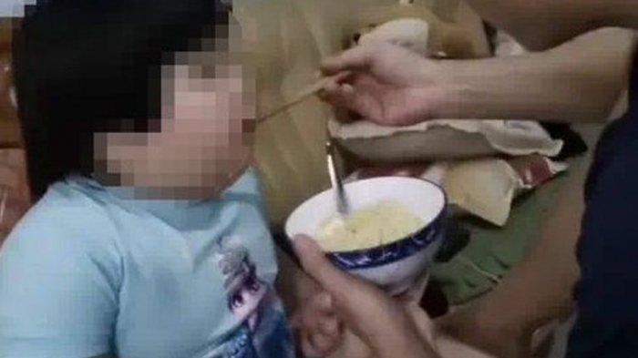 Bocah yang baru berusia 3 tahun tersebut dipaksa untuk memakan ayam goreng dan humberger.