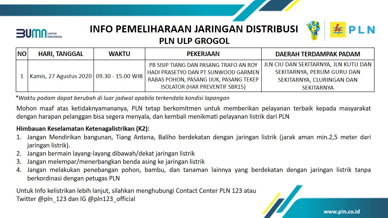 Info Pemeliharaan Jaringan Listrik PLN ULP Grogol Sukoharjo Kamis 27 Agustus 2020