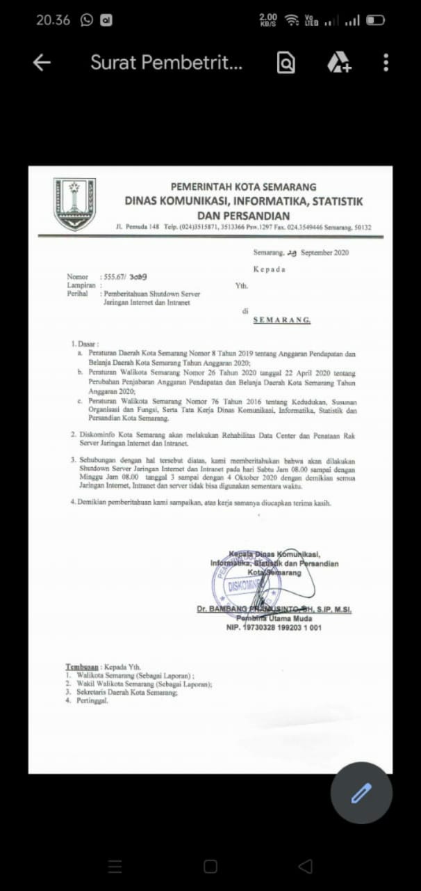TRIBUNJATENG.COM, SEMARANG- Beredar surat pemberitahuan Kepala Dinas Komunikasi, Informatika, Statistik, dan Persandian Kota Semarang, Bambang Pramusinto terkait Shutdown Server Internet menjadi viral di media sosial dan WhatsApp.