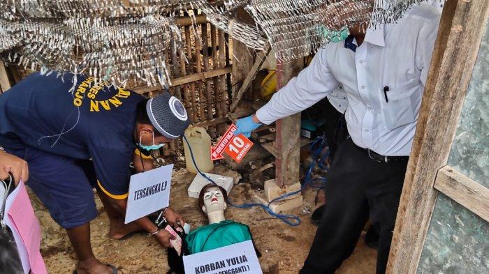 Dalam pra rekonstruksi itu, Polisi menghadirkan langsung tersangka pembunuhan Yulia, yaitu Eko.