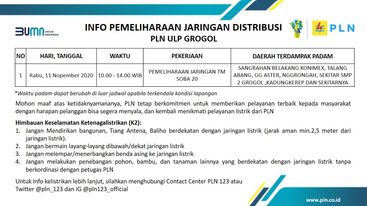 Info Pemeliharaan Jaringan Listrik PLN ULP Grogol Sukoharjo Rabu 11 November 2020