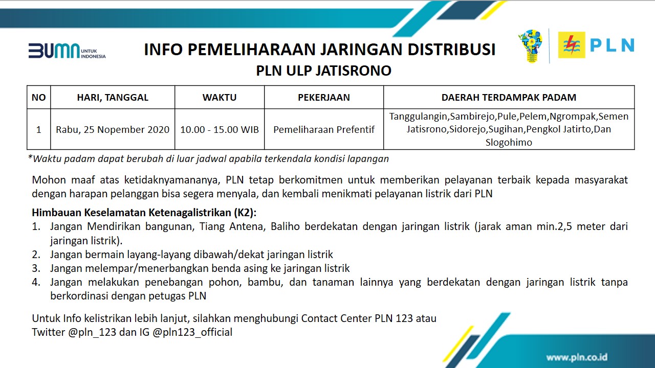 Info Pemeliharaan Jaringan Listrik PLN ULP Jatisrono Rabu 25 November 2020