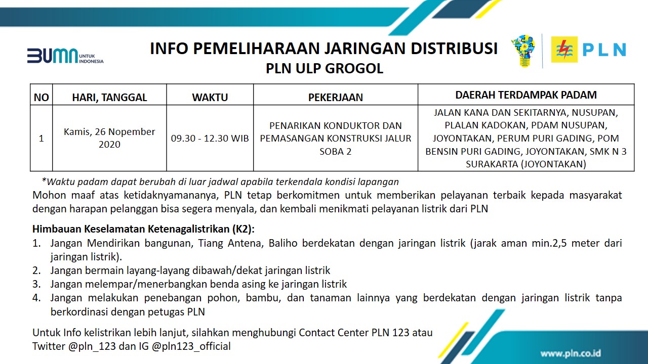 Info Pemeliharaan Jaringan PLN ULP Grogol Sukoharjo Kamis 26 November 2020