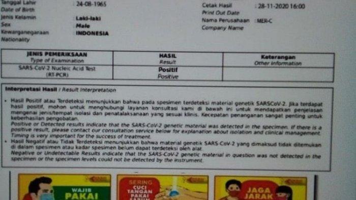 Dalam foto surat keterangan tersebut tertulis hasil positif Covid-19.