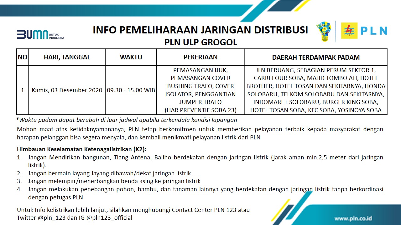Info Pemeliharaan Jaringan PLN ULP Grogol Sukoharjo Kamis 3 Desember 2020