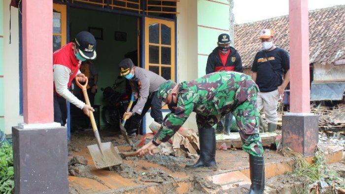 Kapolsek bersama puluhan anggotanya membantu para warga membersihkan lumpur yang masuk ke dalam rumah warga.
