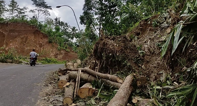 Sebagian material longsor bahkan telah menimbun bahu jalan provinsi.