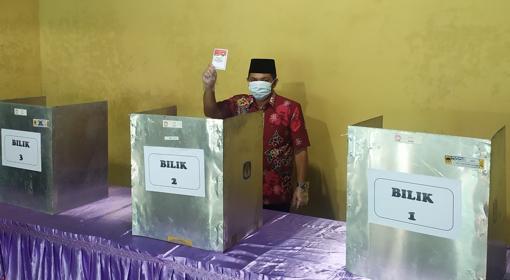 TRIBUNJATENG.COM, UNGARAN - Calon Bupati Semarang nomor urut 2 Ngesti Nugraha menggunakan hak pilihnya di TPS 4 Dusun Gedad, Desa Wates, Kecamatan Getasan, Kabupaten Semarang, Rabu (9/12/2020).