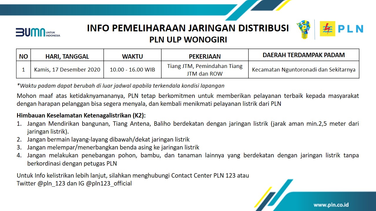 PELANGGAN PLN yang terhormat, dalam rangka meningkatkan pelayanan dan mengamankan pasokan listrik kepada pelanggan, maka dengan ini kami sampaikan informasi Pemeliharaan Jaringan listrik PLN ULP Wonogiri: