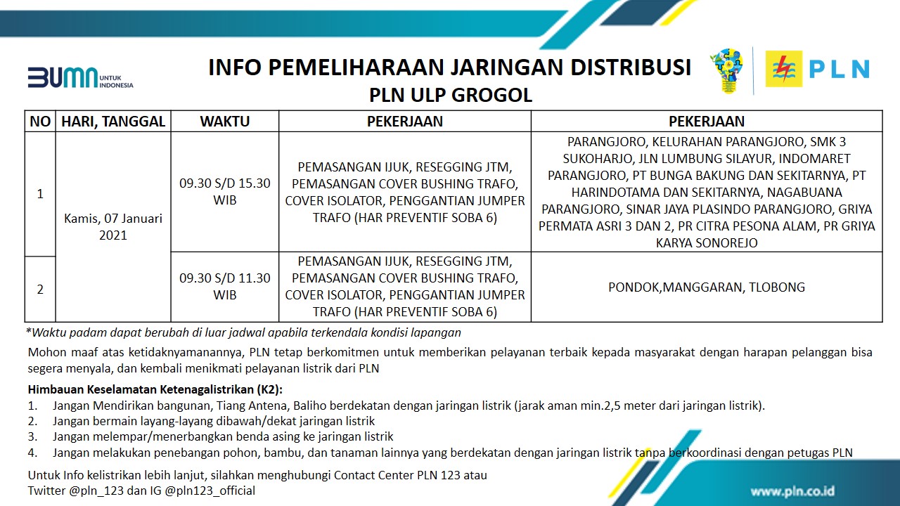 Info Pemeliharaan Jaringan Listrik PLN ULP Grogol Sukoharjo Kamis 7 Januari 2020
