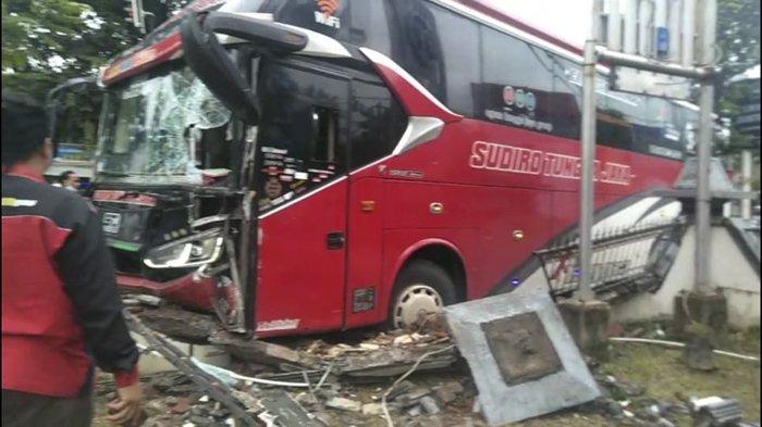 Kali ini, Bus AKAP Sudiro Tungga Jaya, menabrak pagar tembok Kantor Kabupaten Sukoharjo, Jumat (19/1/2021).