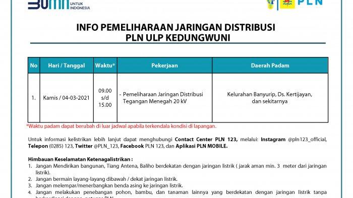PELANGGAN PLN yang terhormat, dalam rangka meningkatkan pelayanan dan mengamankan pasokan listrik kepada pelanggan, maka dengan ini kami sampaikan informasi Pemeliharaan Jaringan listrik PLN ULP Kedungwuni :