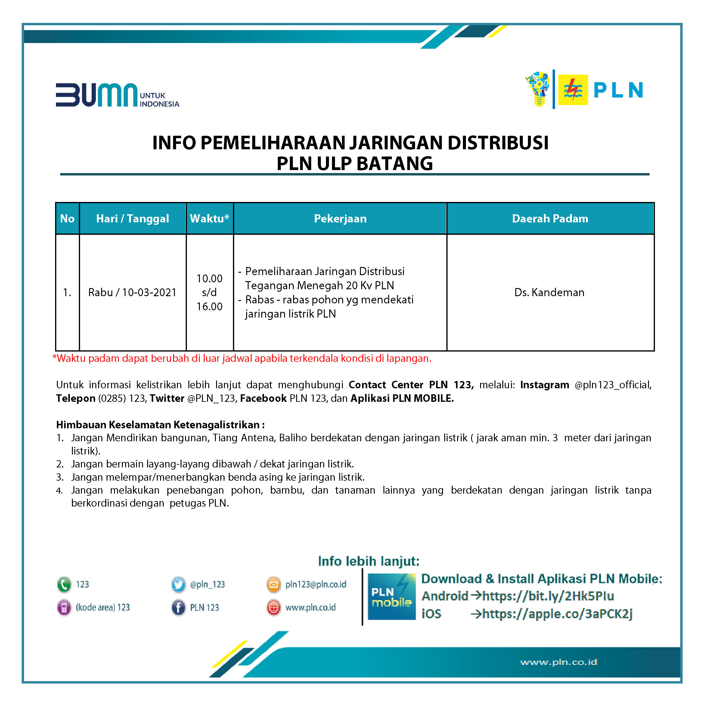 PELANGGAN PLN yang terhormat, dalam rangka meningkatkan pelayanan dan mengamankan pasokan listrik kepada pelanggan, maka dengan ini kami sampaikan informasi Pemeliharaan Jaringan listrik PLN ULP Batang :