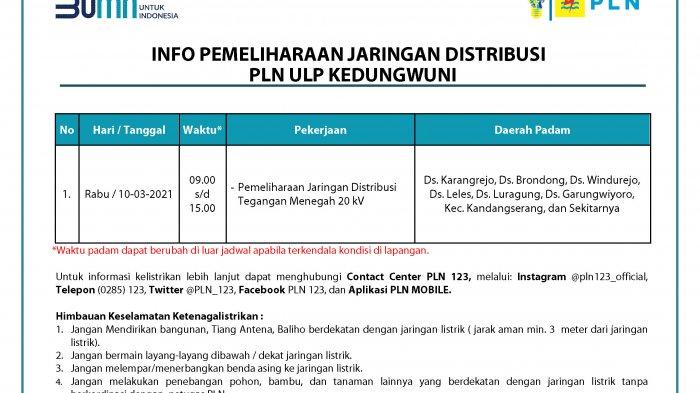 PELANGGAN PLN yang terhormat, dalam rangka meningkatkan pelayanan dan mengamankan pasokan listrik kepada pelanggan, maka dengan ini kami sampaikan informasi Pemeliharaan Jaringan listrik PLN ULP Kedungwuni :