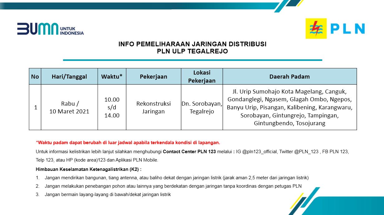 Info Pemeliharaan Jaringan Listrik PLN ULP Tegalrejo Magelang Rabu 10 Maret 2021