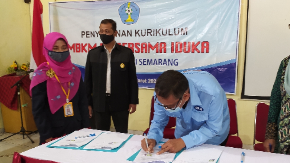 Penandatangan naskah kerjasama antara direktur AKS dengan IDUKA disaksikan juga oleh Ketua Yayasan Ibu Kartini beserta pengurus yayasan. Hadir pula Kepala SMK Ibu Kartini sebagai sekolah binaan.