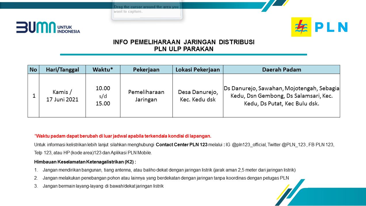 Info Pemeliharaan Jaringan Listrik PLN ULP Parakan Temanggung Kamis 17 Juni 2021