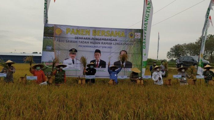 Balai Penelitian Lingkungan Pertanian (Balingtan) mengadakan kegiatan panen bersama demfarm pengembangan padi sawah tadah hujan ramah lingkungan di Dusun Playon, Desa Sokopuluhan, Kecamatan Pucakwangi, Pati, Kamis (17/6/2021).