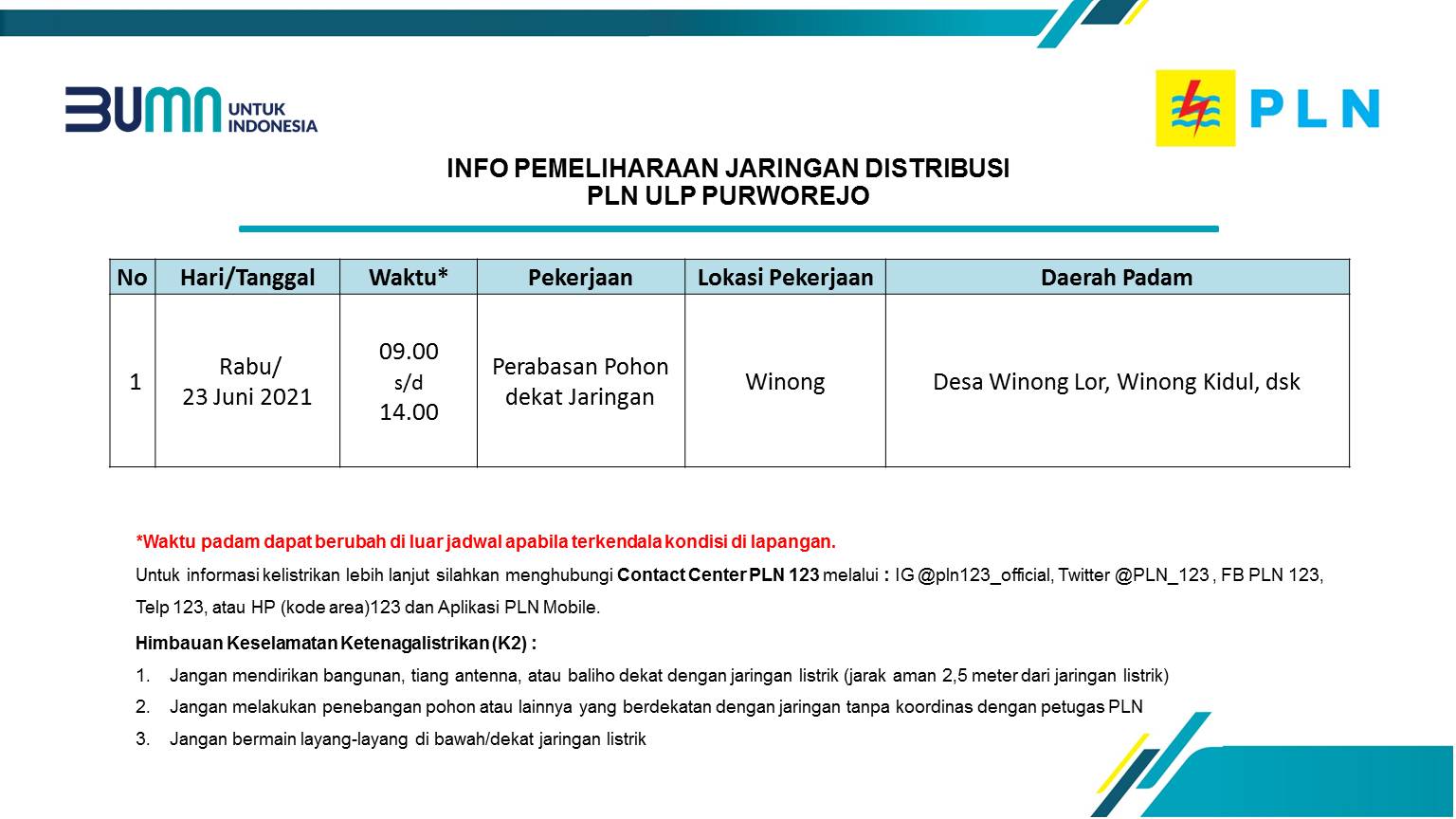 Info Pemeliharaan Jaringan Listrik PLN ULP Purworejo Rabu 23 Juni 2021