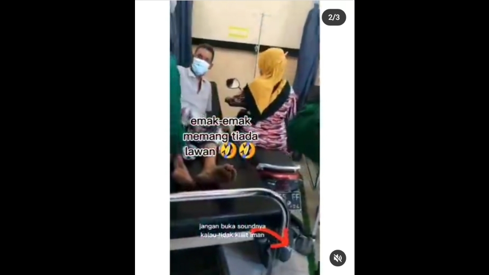 Dalam video tersebut tampak emak-emak menurunkan pasien pria yang diboncengnya dari motor tepat di bed IGD rumah sakit.