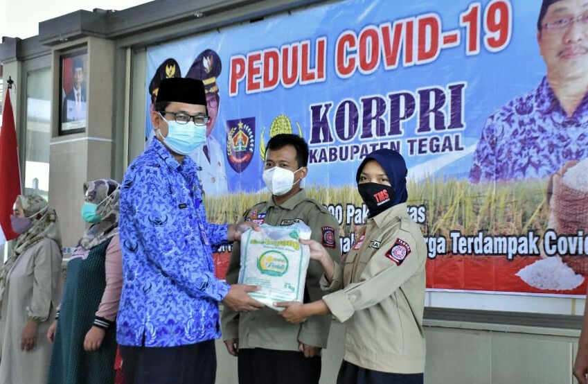 TRIBUNJATENG.COM, SLAWI – Pegawai Negeri Sipil (PNS) Pemkab Tegal melalui Korps Pegawai Republik Indonesia (Korpri) kembali salurkan bantuan sosial berupa beras premium sebanyak 5 kilogram untuk 2.000 keluarga terdampak pandemi Covid-19.