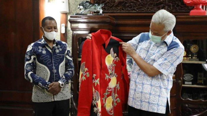 TRIBUNJATENG.COM, SEMARANG - Rektor Universitas Cendrawasih (Uncen) Papua, Apolo Safanpo, memberikan sepasang batik bermotif burung Cendrawasih kepada Gubernur Jawa Tengah, Ganjar Pranowo.