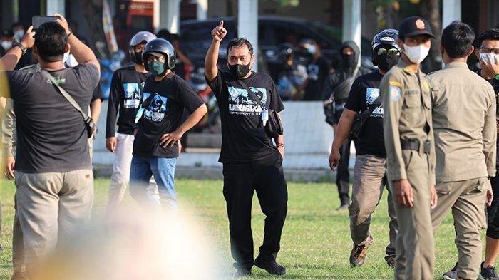 Suporter menggunakan kaus warna hitam bertuliskan 'Laskar Singo Lawu' meminta para pemain AHHA PS Pati untuk bubar.