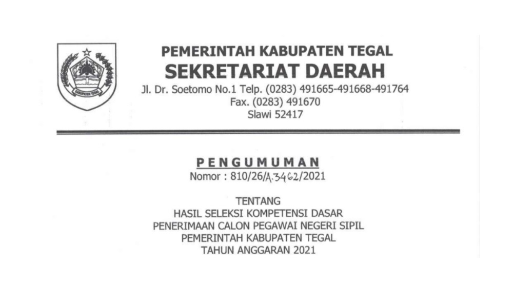 Pengumuman hasil SKD CPNS 2021 Kabupaten Tegal bisa dilihat di sini.