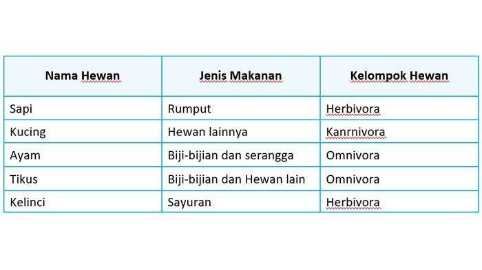 Jawaban: Hewan herbivor, karnivor, dan omnivor.