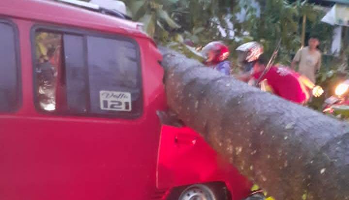 Sesampainya di lokasi, pohon tumbang dan menimpa mobil angkudes tersebut.