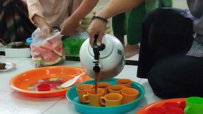 Kopi akan dibagikan ke jemaah masjid yang sudah duduk melingkar di bagian belakang masjid.