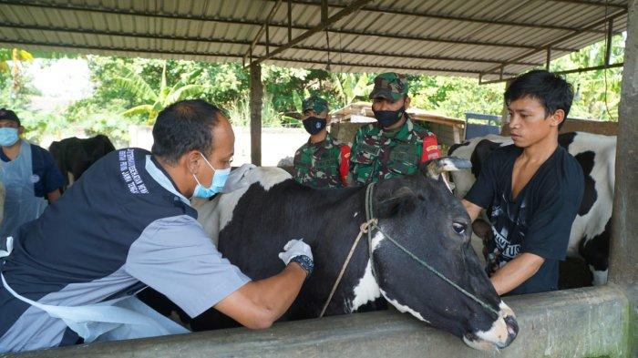 TRIBUNJATENG.COM, KAJEN - Komandan Kodim 0710 Pekalongan Letkol Inf Rizki Aditya, mengintruksikan jajarannya untuk melakukan pendampingan pemberian vaksinasi PMK, kepada sapi yang dilakukan oleh Dinas Ketahan Pangan dan Peternakan (DKPP) Kabupaten Pekalongan.