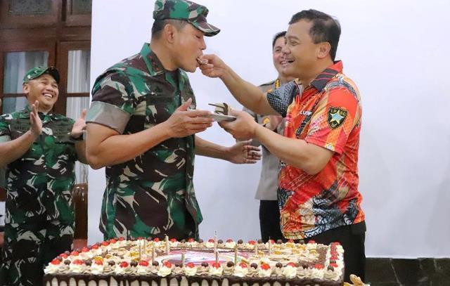 Kapolda memotong kue ulang tahun pemberian anggota Kodam dan menyuapkannya ke Mayjen Widi.