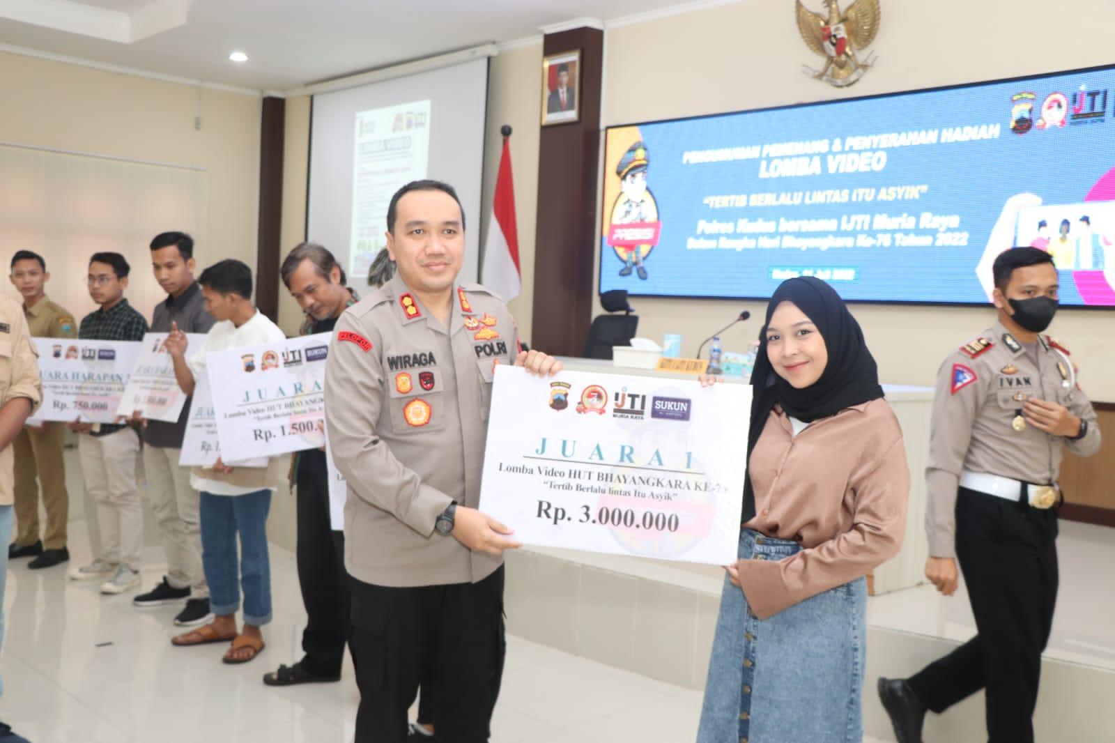 Kapolres Kudus AKBP Wiraga Dimas Tama bersama Ketua IJTI Muria Raya Indra Winardi mengumumkan pemenang dan menyerahkan hadiah kepada pemenang yang mengangkat tema 'Tertib Berlalu Lintas Itu Asyik'.