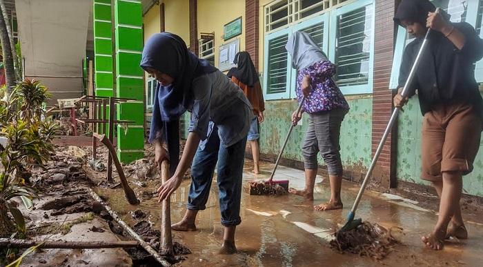 Akibatnya, kegiatan belajar-mengajar terpaksa diliburkan sejak Kamis. Para guru bergotong royong membersihkan sekolah.